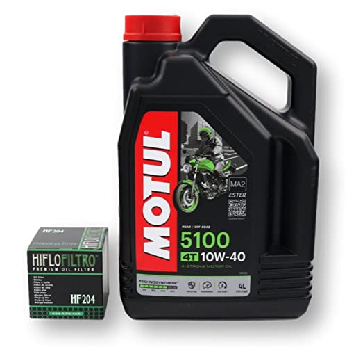 RVM Kit Aceite Motul 5100 10W40 Moto 4T + Filtro De Aceite Hiflofiltro Modelo HF 204 Para Motos Honda, Yamaha Y Kawasaki. Aceite Semisintético En Envase De 4 Litros