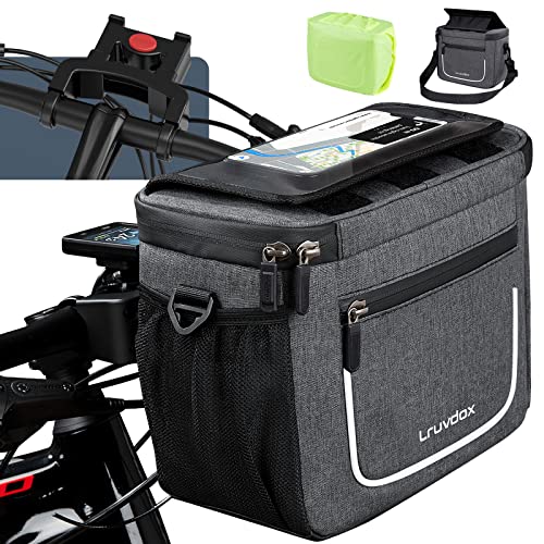 Lruvdox Bolsa Manillar Bicicleta 5L con Adaptador para Bicicletas y Bicicletas eléctricas, Soporte movil Bicicleta Impermeable Cesta Delantera Cuadro montaña con Pantalla táctil y Bandolera extraíble