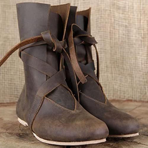 Botas Medievales De Cuero De La PU - Retro Mujeres/Hombres Caballero Pirata Disfraz Tobillo Corto Botas De Fondo Plano Zapatos De Vendaje Gótico para Cosplay Fiesta De Carnaval,Marrón,41