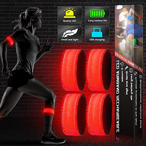 Brazalete Reflectante Running, 4 PCS Banda Reflectante Recargable con USB, Alta Visibilidad y Ajustable Brazalete Led para Correr, Andar en Bicicleta, Deportes al Aire ibre (Rojo)